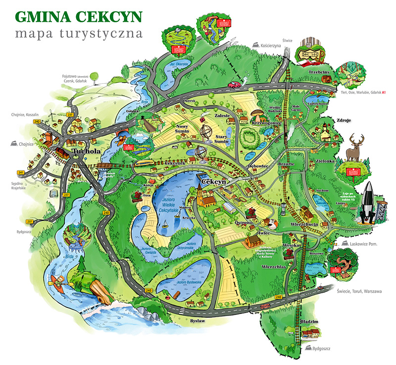 tagi: ilustrowana mapa turystyczna, cekcyn, tuchola, rysowane piktogramy