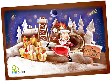 Kartki świąteczne drukowane w formie pocztówek wykonane dla stowarzyszenia Buko z Piły Młyn w powiecie tucholskim.