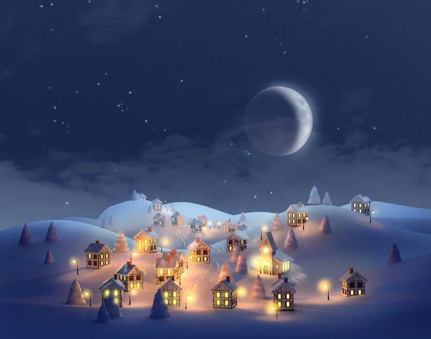 Zimowo-świąteczna grafika. Górska wioska nocą przykryta śniegiem.