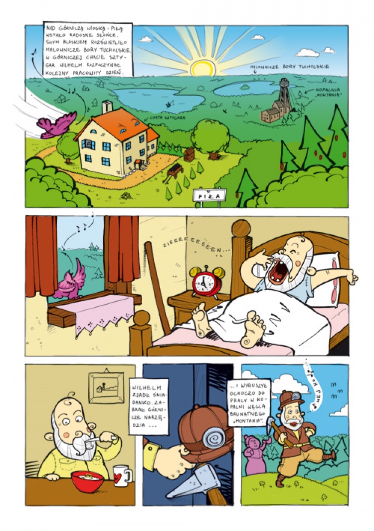tagi: ilustracje, komiks, piła młyn wioska górnicza, tuchola, druk, folder