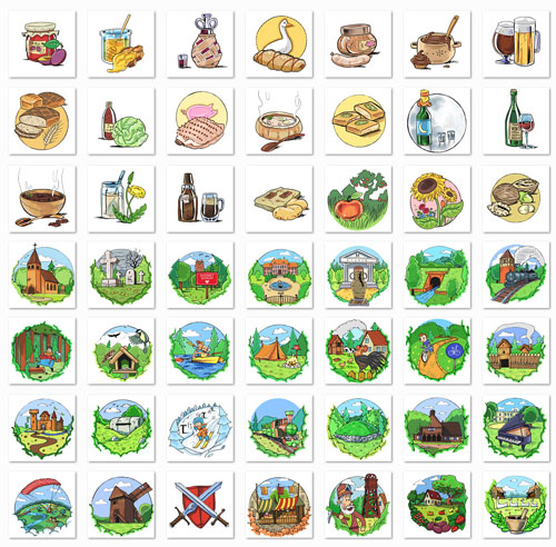 Rysunki przedstawiające produkty lokalne oraz atrakcje turystyczne województwa kujawsko-pomorskiego.
